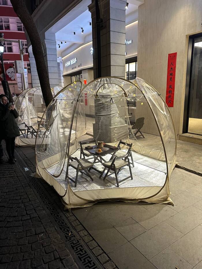 10) Лайфхак для холодной погоды. Тенты для уличных столиков с подогревом и защитой от ветра. Вариант осенне-зимних террас в заведениях