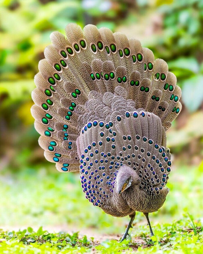 Перед вами павлиньи фазаны (Polyplectron). Обитатели влажных тропических лесов Индокитая. Сказать по правде, хвост его больше напоминает индюшиный своей формой, а вот расцветка – своего рода интерпретация павлиньих глазков.