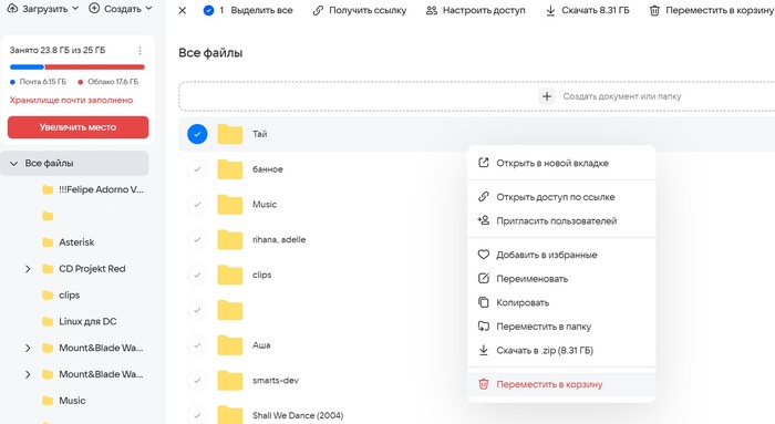 Итак, файлы скачаны, теперь можно их спокойно удалить из облака. Для этого выделяем каталоги и файлы, чтобы появилась синяя галочка, и жмём «Переместить в корзину» в меню сверху, либо кликаем правой кнопкой и выбираем пункт в появившемся списке.