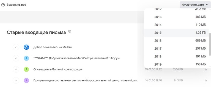 В этом разделе тоже есть фильтр по дате, и самые объёмные письма будут сверху списка:
