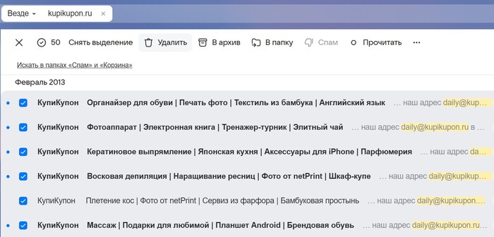 Короче, как я и говорил ранее, если вы не помните что в письмах десятилетней давности, скорее всего они вам не нужны, и можно их спокойно удалять. Можно выделять письма по одному, или сразу пачкой. Справа сверху будет указан объём выбранных писем и кнопка удалить.