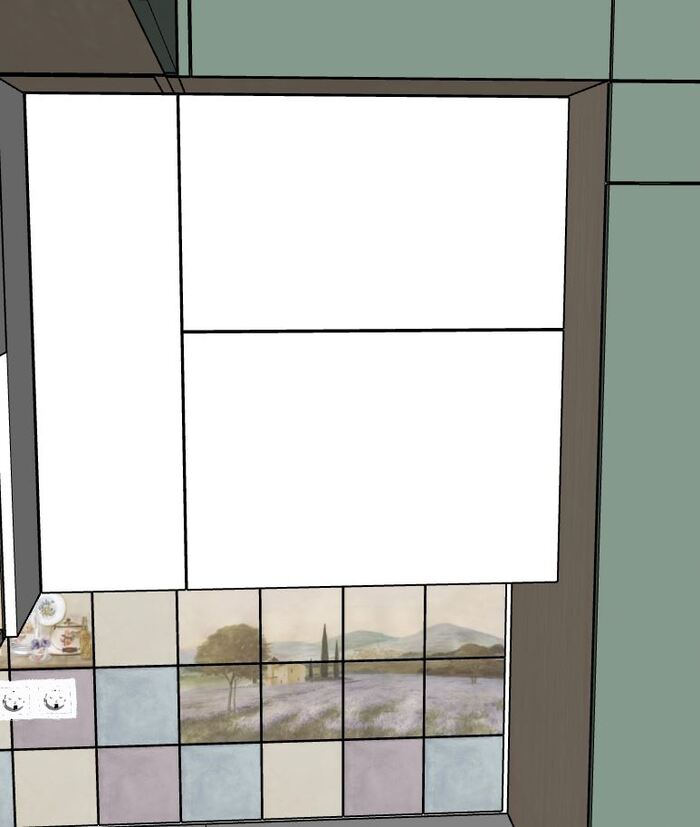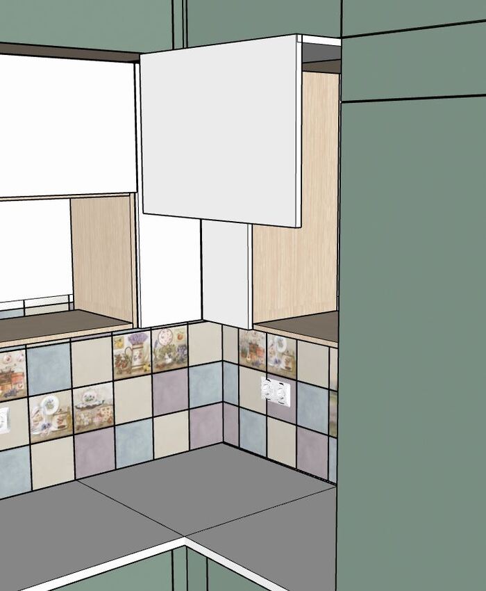 Если створки выполнить равными по высоте, и открыть фасад на 90* - нижний край оказывается на уровне 178см от пола. Среди пользователей кухни у всех рост 180см и выше.