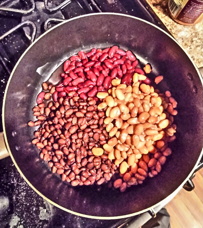 Три стандартные банки фасоли. Мне нравится использовать три разных вида, обычно просто выбираю их наугад, в местном супермаркете их около 10 разных видов. Мне нравятся все виды фасоли.