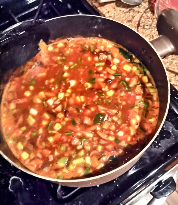Затем нарежьте свежие овощи и овощи из банок и добавьте их, добавьте бульон. Я использовал порошкообразный, так что просто вода и порошок, иногда я использую тот, который уже приготовлен в виде жидкости. Как вам больше нравится.