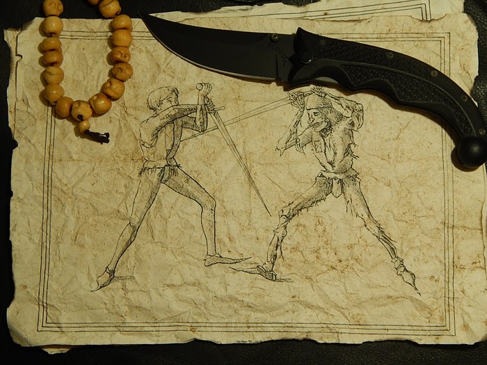 И вспомнилась мне серия гравюр, интересная тем, что была она стилизована под фехтубки различных эпох, и тем ещё, что в качестве противника фехтовальщика неизменно выступал Господин Смерть.