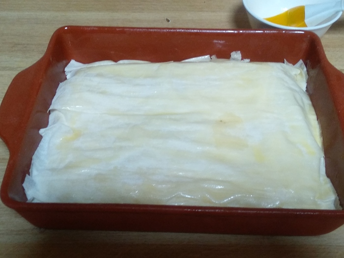 Немного смажьте топленым маслом. Оставшиеся листы тесты выложите сверху (смазывая каждый лист), заправляя внутрь, смажьте топленным маслом.