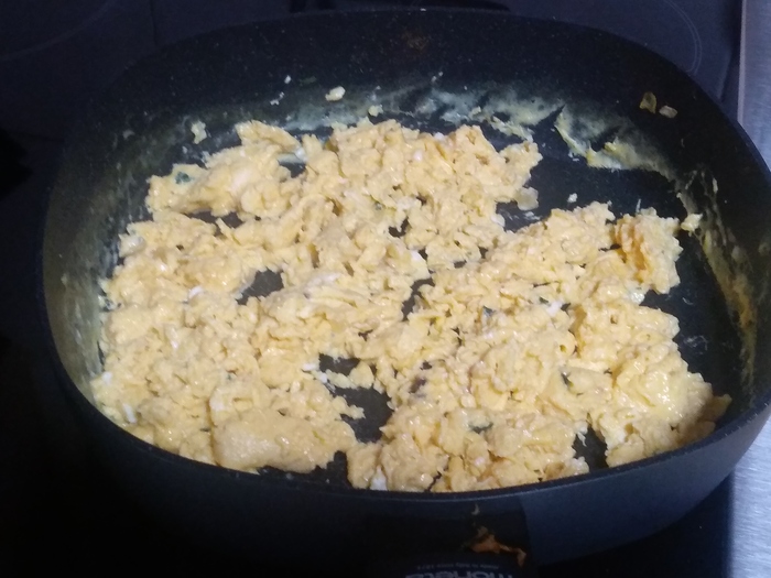 В миске взболтайте яйца. В сковороде нагрейте оливковое масло. Добавьте взболтанные яйца и 2 ст.л. жидкости от курицы, приправьте солью и жарьте, разбивая на мелкие кусочки. Снимите с огня.