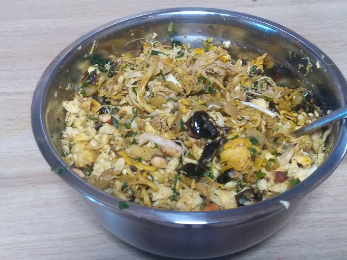 Миндаль обязательно пожарьте и крупно нарежьте. Шафран замочите в воде. Чернослив нарежьте. Петрушку, кинзу нарубите. На сковороде обжарьте нарезанный лук. Добавьте измельченную курицу, специи, имбирь, воду с шафраном, чернослив, соль, кинзу, петрушку, перемешайте и снимите с огня.