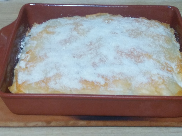 Смажьте форму растопленным топленым масло. На дно - 2 листа теста, смазанных растопленным маслом. Затем на дно и по кругу, каждый раз смазывая топленным маслом (метод сборки как в пастилла с говяжьим фаршем).Выложите половину начинки, сверху накройте несколькими свисающими краями теста (смазывайте маслом). Затем остальную начинку. Выложите оставшееся листы (оставить 2 листа) теста, также смазывая маслом, снова по кругу и затем сверху начинку. Сложите все листы теста над начинкой, заправляя по краям. Сверху 2 листа и снова заправьте по краям. Смажьте растопленным маслом. Выпекайте при температуре 180C 25-30 минут, до золотисто-коричневой корочки. Дайте остыть 5 минут. Посыпьте сахарной пудрой с корицей. Можно миндальной мукой.