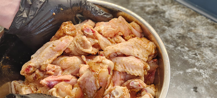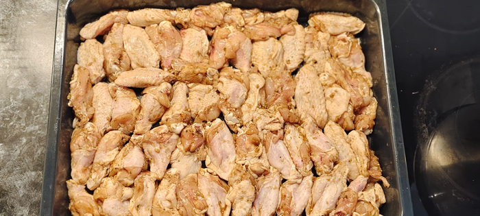 Крылья, чеснок, соевый соус, соус Вустреский, приправа для крыльев и соус BBQ ну и перчатки!