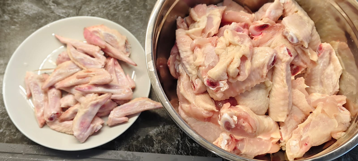 Разрубаю крылья на части. Фалангу последнюю откладываю. Сгодится на бульон