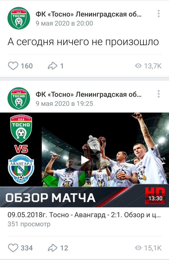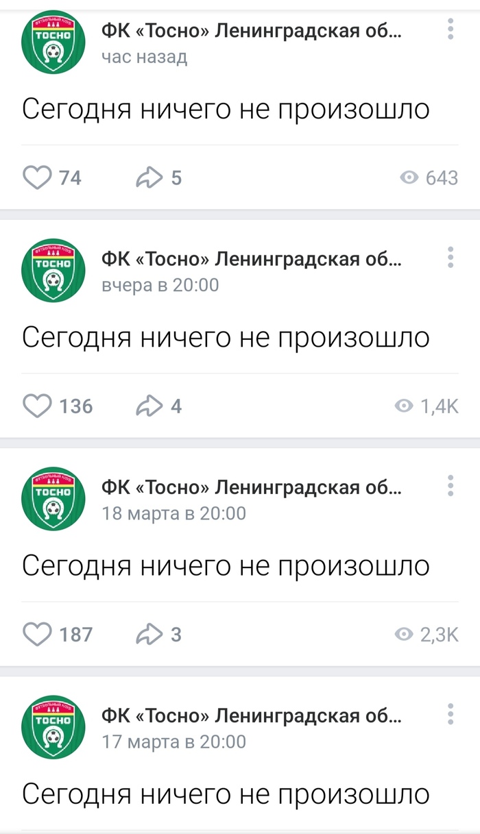 Листал себе VK и в рекомендациях наткнулся на группу ФК "Тосно", который расформирован в 2018 году. Дай посмотрю, что там происходит.