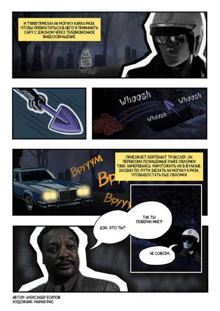 -Эд Трэкслер:-Так Ты поверил мне,что там обломки!- (про которые он ему утверждал когда-то раннее, а настоящий Дэн не верил!),(в могиле с Кайлом Ризом были оставлены Ноги и Таз Терминатора и еще в теле у К.Риза фрагмент)!
