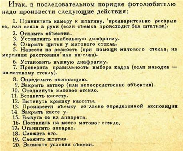 Сейчас фотографировать стало просто, навёл, нажал кнопку и готово. А вот с таким аппаратом приходилось повозиться. Ознакомтесь с инструкцией: