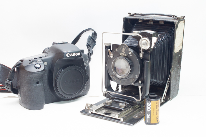 Фотокор-1 рядом с моим основным цифровым фотоаппаратом для масштаба. Да, я не ставил батарейную ручку, но и сам по себе Canon 7d не очень чтобы маленький.
