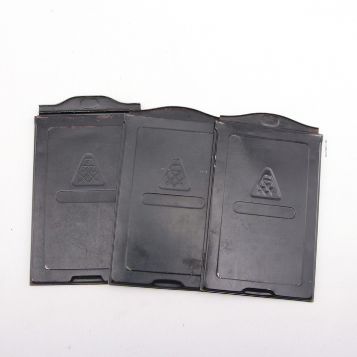 Фотоаппарат, как я уже сказал выше - пластиночный. Светочувствительным материалом здесь является не фотоплёнка на много кадров, а фотопластинка. Покрытый светочувствительной эмульсией кусочек стекла в светонеприницаемом пенальчике. На фото слева собственно сам пенальчик, на фото справа - он открыт и видна пластинка.