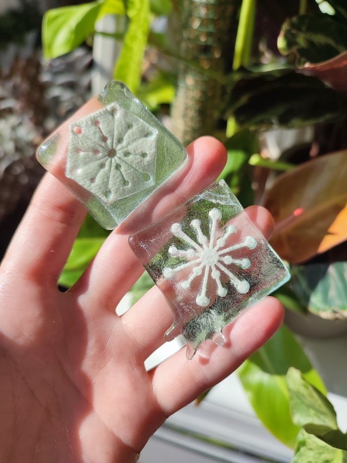 Керамическая бумага, нарезанная фигурным степлером, отлично запекается между слоями стекла, получаются забавные льдинки