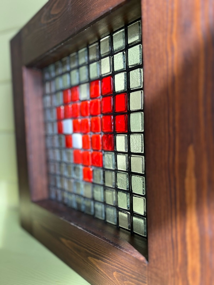 Мелочи приходится аккуратнейшим образом выкладывать тонким пинцетом. Борин чубчик сделан из наколотых стеклянных струн. Их вытягиваем из кусочков цветного стекла размягченного в пламени стеклодувной горелки. Крошки получаем дроблением стекла в ступке и последующим рассеиванием на нескольких номерах сит.
