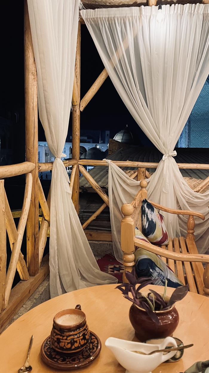 Сказать, что дорога из Ташкента в Самарканд была утомительная - это ничего не сказать. В Узбекистане на трассе везде камеры и радары, водители едут со скоростью 70-80 км/ч и расстояние в 300 км мы проехали за 4.5 часа вместо 3. Я приехала ужасно вымотанная и никуда не хотелось идти гулять, я заселилась в хостел и только к вечеру вылезла на одну из достопримечательностей, хотя в этот день я рассчитывала посетить половину из них, потому что всего у меня было 2 дня на Самарканд. На следующий день программа была очень плотная, поэтому с самого утра я посещала одну достопримечательность за другой. На площади Регистан договорилась с 3 русскими девушками скинуться на гида, и это было лучшим решением. Там же мы пили кофе на балкончике стариной медресе.