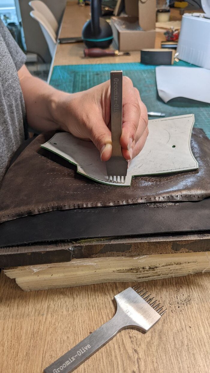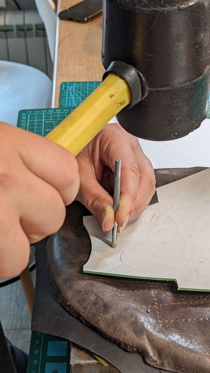 Приступаем к разметке отверстий для шитья. Отступаем от края 3-4мм, проводим линию шилом и намечаем отверстия.