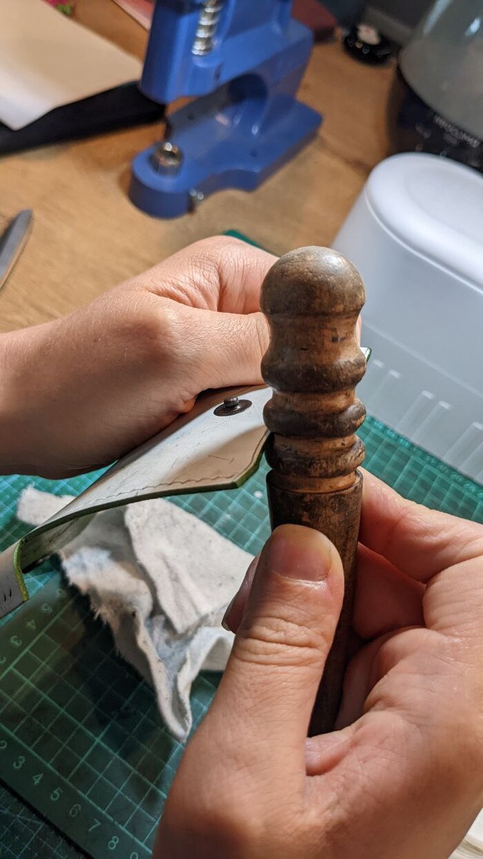 Чтобы стук киянки не тревожил соседей я использую стальной лист толщиной 10мм и несколько слоев пенки. Эта конструкция отлично гасит вибрацию и шум. А если подложить под это всё дело еще и толстый шерстяной свитер, то можно работать и ночью. А чтобы не тупился инструмент, под заготовку кладу несколько слоев кожи из тех изделий, которые не получились. Поверьте, если вы займетесь работой с кожей у вас тоже будет гора неликвида)