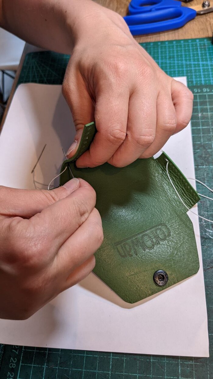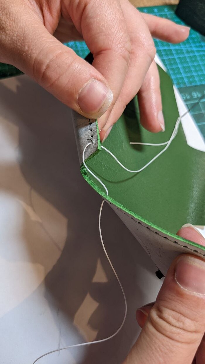 Шьем седельным швом (При прошиве седельным швом, нитки не переплетаются внутри кожи и не возвращаются каждая на свою сторону, а вместо этого, они пересекаются внутри кожи и переходят на противоположную сторону). Продеваем с изнанки "ушка" заготовки нить через нижнее отверстие, далее так же изнанки в нижнее отверстие нижней части будущего кошелька.