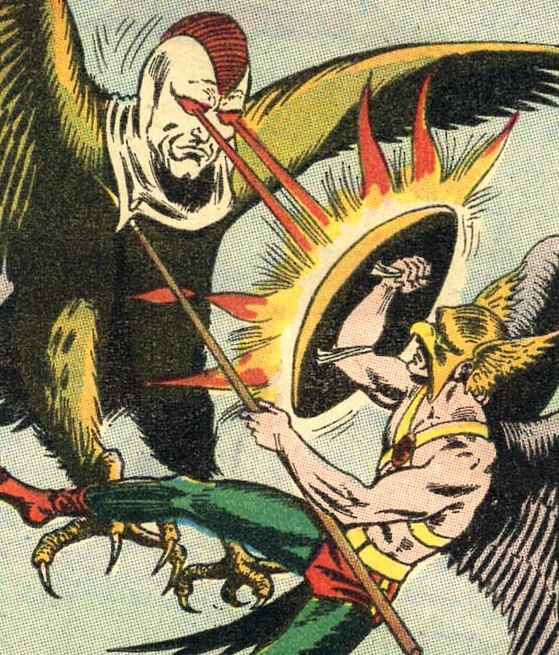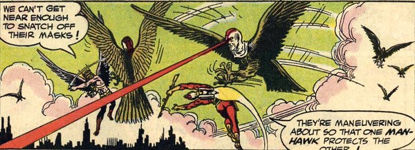 И там их ждут новые заботы в комиксе The Brave and the Bold #43. На Землю нападают танагарские твари, Орлолюди – исполинские орлы в масках с человеческими лицами, которые стреляют лучами из глаз! В качестве точки начала вторжения они выбрали, разумеется, Мидуэй Сити. А кто-то ещё жаловался, что все инопланетяне нападают на Нью-Йорк. По пути к Мидуэю Катар вспоминает события прошлого, когда он был ещё подростком. Тогда на столицу Танагара напали Орлолюди, но тогда их маски могли только испускать ослепительные вспышки. Катар в то время с батей тестировал различные модели крыльев, чтобы понять, по каким принципам удобнее летается различным птицам. Катару удалось тогда отжать одну из масок, его батя изучил, как маски работают, и создал шлемы в форме орлиной башки, которые защищают от вспышек. Эти шлемы и пояса с крыльями легли в основу реформы полиции – полиция Танагара стала Орлиной Полицией.