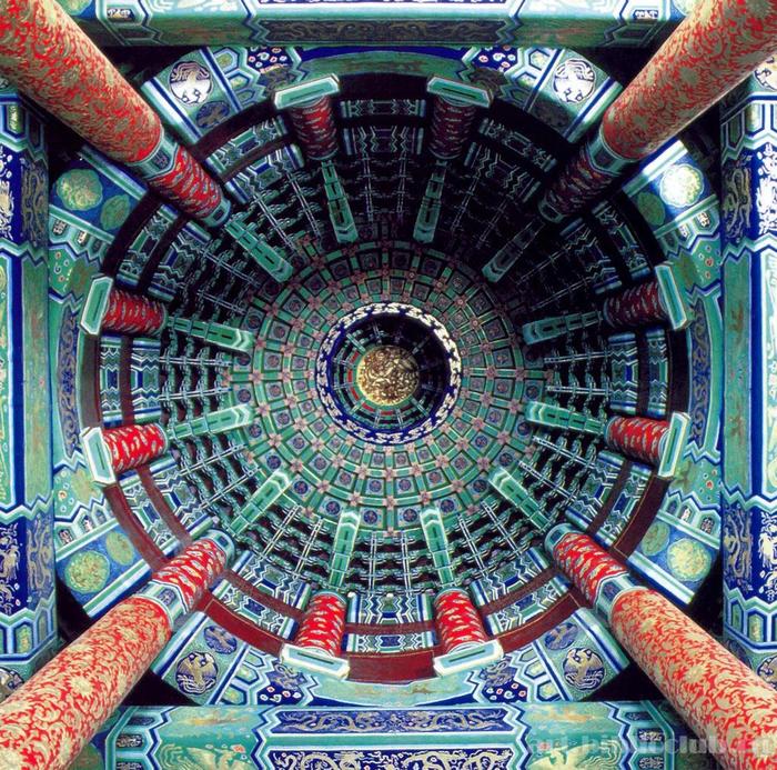 В центре расположены четыре 20 метровые колонны «драконьего колодца. Они связаны между собой гнутыми балками, служащими опорами для купола. И купол и сами балки покрыты росписью, а под сводом купола можно разглядеть парящего дракона. На центральной плите пола, также можно разглядеть дракона в затейливом рисунке каменных прожилок. Храм служил для моления о дождях и хороших урожаях.