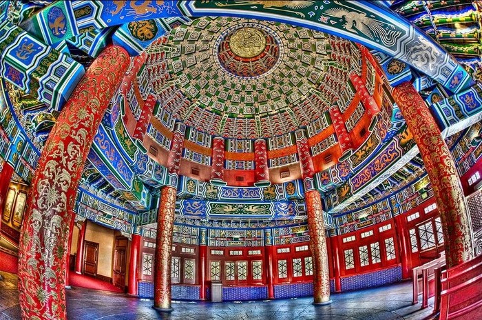 Следующим пунктом на нашей дороге стоит «Храм Богатого Урожая», окруженный квадратной стеной. Крышу его покрывает синяя, сверкающая черепица, а поддерживают ее 28 огромных колонн, символизирующих 28 созвездий, считавшихся в Китае священными. Колонны покрыты красным лаком и рельефным золотым орнаментом. Размеры храма не очень большие, диаметр 30 метров, а высота 38 метров, но внутренний зал просто поражает.
