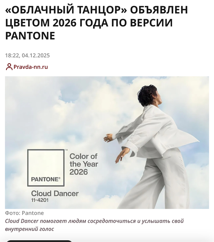 Цветом 2026 года по версии Pantone назван «облачный танцор» — нейтральный белый.