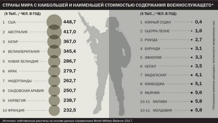 Такие небольшие расходы на военнослужащего в России по сравнению с США во многом объясняют плачевные итоги боевых действий в Чечне, когда федеральные войска обладали авиацией и подавляющим преимуществом в боевой технике, тем не менее показали низкие боевые качества. В сравнении с нерегулярными чеченскими формированиями наши солдаты и даже офицеры имели полупартизанский вид, потому что не были обеспечены самыми элементарными нормами довольствия. В этом отношении чрезвычайно необходимо учесть человеческий фактор, который при эксплуатации вооружения имеет громадное значение.