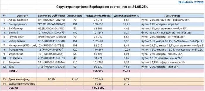 По состоянию на 24.05.25г. стоимость портфеля Барбадос составляет 1 094 209 р. (-0,3% за неделю). В уме держим купон от Воксис в сумме 2,3 тыс. р., который придет в понедельник, но даже с учетом этого купона, за прошедшую неделю портфель претерпел коррекцию.