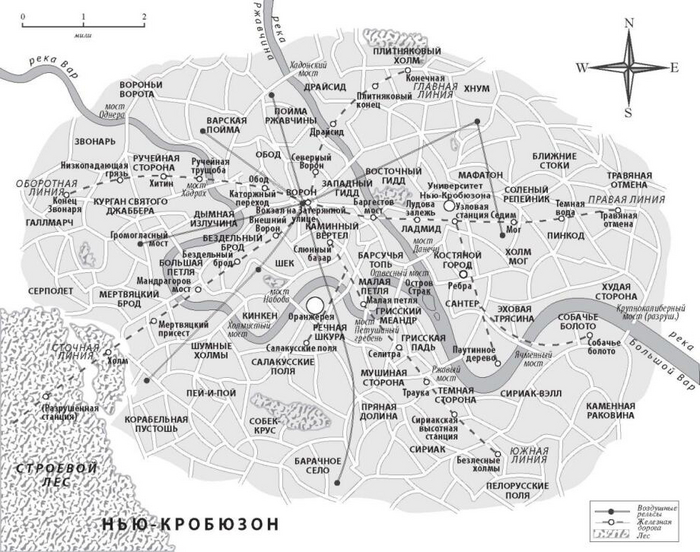 Чайна Мьевиль проводит читателю экскурсию по городу – вот ржавые доки, где водяные устраивают забастовку, не давая кораблям покинуть порт. Вот гетто кактов (людей-кактусов), накрытое стеклянным куполом. Вот огромная свалка, на которой обрели разум выброшенные паровые механизмы. Видно, что автор увлечён этой экскурсией куда больше, чем собственно сюжетом и персонажами. Он любуется созданным городом, смакует каждую грязную подворотню.