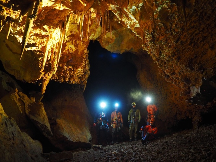 Наступило ещё одно тёплое осеннее утро. Где-то высоко в небе ветер весело гнал небольшие перистые облака по синему небу. Пока ребята потихоньку просыпаются, я созерцаю эту безмятежную картину с кружкой горячего кофе и осматриваю кучу снаряжения - верёвки, карабины, обвязки, протекторы. Несказанно радует что идти до пещеры совсем не далеко - примерно полтора километра. Конечно можно надеть всю снарягу там, но не хочется тратить на это время) а сразу прийти и начать провешивать верёвку и почувствовать холодное дыхание подземного мира. Так и поступаем, надеваем комбинезоны, обвязки, берем бухты веревки и выдвигаемся к пещере, карабины весело гремят на обвязке. Обычно входы в пещеры это довольно узкие лазы и шкуродеры, но вход в Бездонный колодец представляет обширную каменную воронку уходящую в непроглядную темноту. Дальше всё предельно просто, навязывается первый узел верёвки, крепится к точке и можно спускаться вниз, вкручивать проушины, делать перестёжки и так на все 170 метров до дна. Уже свободно спускаясь в колодце осознаёшь величественные просторы которые выточила обычная вода имея в своём запасе миллиарды лет. Поток солнечного света слегка мерцая освещает заросшие мхом стены первых 30 метров колодца, а дальше плавно перетекает на потрескавшийся серый камень. А надо мной покачивались деревья с золотистыми листьями на фоне ярко синего неба, с изредка проплывающими небольшими облачками. Иногда в медленном танце мимо меня пролетали листья, в этом безмолвии ощущается некое подобие безмятежного счастья.