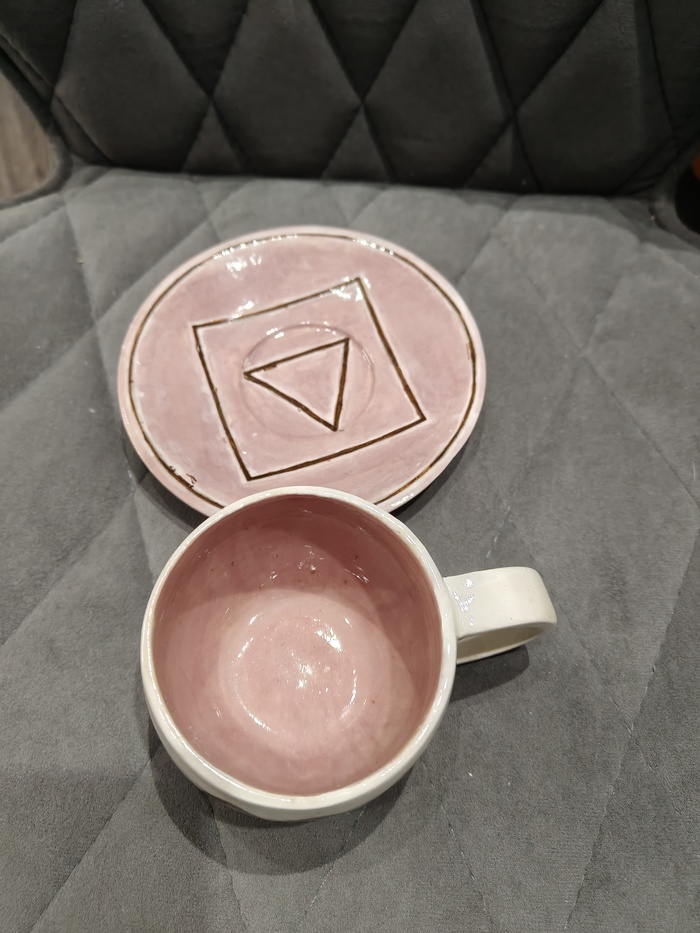 Чашку делала на гончарном круге, а блюдце отминкой по гипсовой форме. Ручку вытягивала. Этот крайне странный со стороны метод, если кому интересно, я описывала в этом посте - Кувшин классик. Керамика ручной работы.