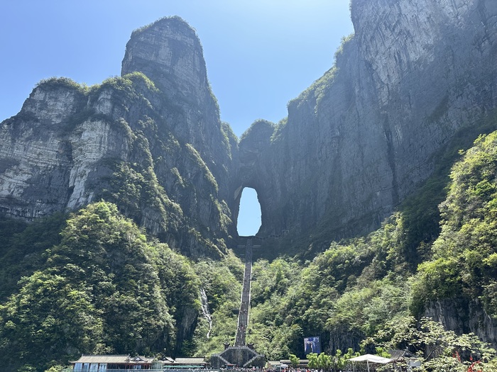 Пещера (врата) Тяньмэнь, расположенная на вершине горы Тяньмэнь, представляет собой естественную разрушенную водой пещеру с самым высоким проёмом в мире. Она проходит с юга на север высотой 131,5 метра, шириной 57 метров и глубиной 60 метров. Сквозь нее проходят облака, туман и солнечный свет. Храм Тяньмэнь, занимающий площадь более 10 000 квадратных метров, превратился в место паломничества и поклонения как буддийский центр Западной Хунани со времен династии Мин (1368-1644).