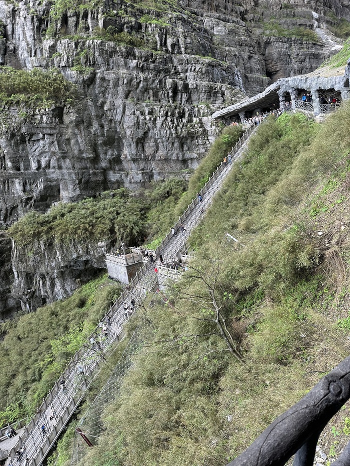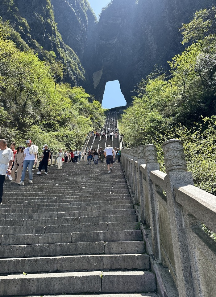 Мы поднялись и отправились пешком в эту гору к вратам неба. Там можно вместо этой длинной лестницы подняться на эскалаторе.