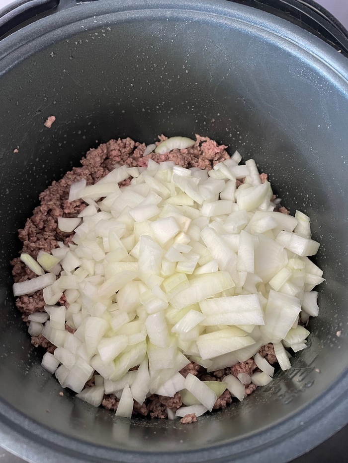 3. Ну и бахнем туда лук. Можно почти сразу перемешать и накрыть крышкой.
