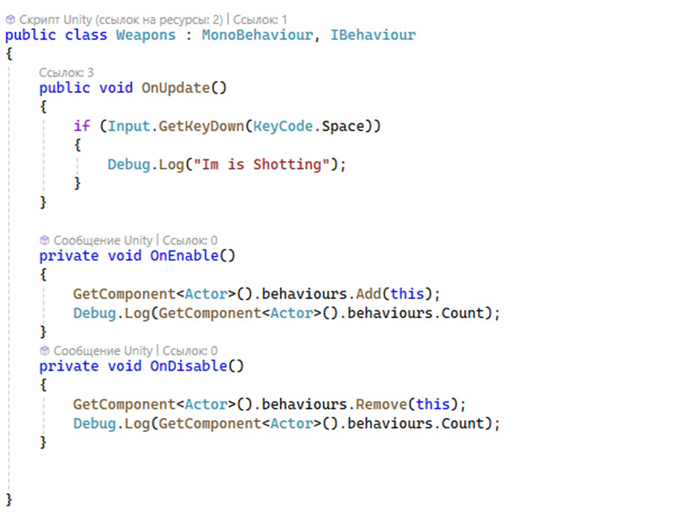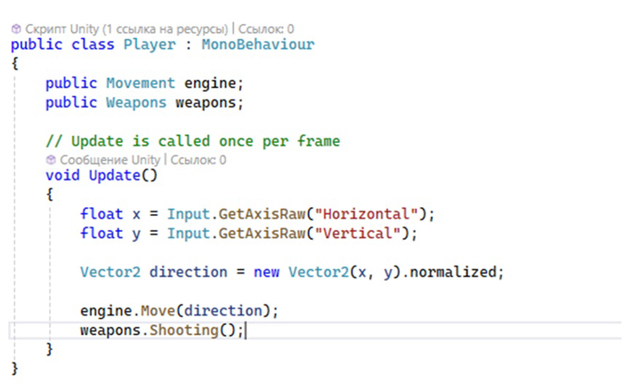Мы бы написали что-то вроде этого, и после добавили бы переменную Weapons в класс Player и вызвали бы в методе Update метод стрелять.