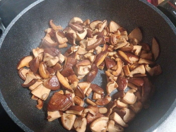 – Добавьте лук и шиитаке, томите 10–15 мин на медленном огне.