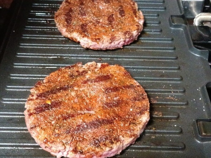 Разогрейте гриль и пожарьте котлеты до внутренней температуры 55-58С. Во время жарки посолите из мельницы. Следом срезы булочек (можно немного обжарить и верхушки булочек).