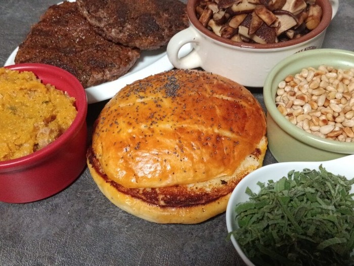 Сочные грибы, обжаренные до золотистой корочки, придают бургеру глубокий аромат и уникальный вкус. Кедровые орехи добавляют нотку хруста и богатый ореховый привкус. Ароматный шалфей, с его травяными нотками, придает бургеру изысканность и особый шарм. Он подчеркивает вкус каждого ингредиента и создает гармоничное сочетание с тыквой, грибами и орехами.