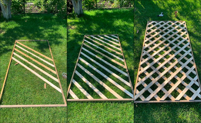 Начала крепить первую диагональ - рейки шли под углом 45 градусов. Каждую крепила саморезами к внутренней стороне рамки. Главное - выдержать угол и расстояние между рейками.
