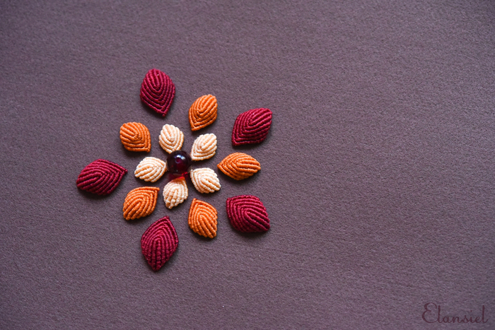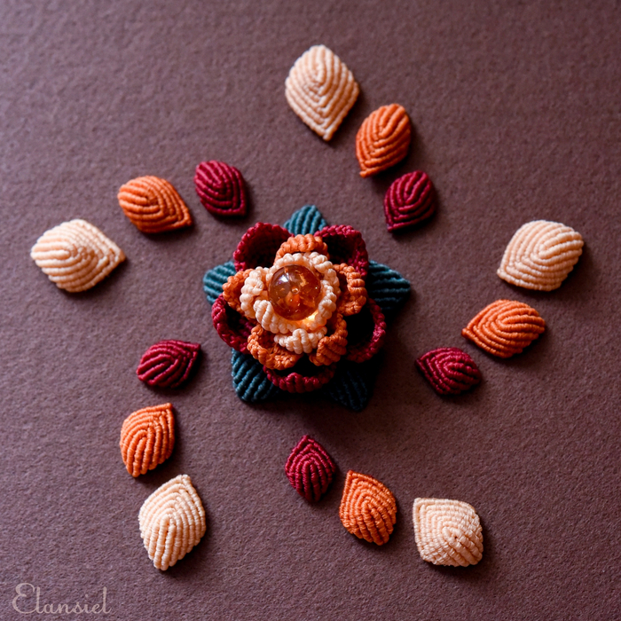 Сначала нужно сплести 15 лепестков, обрезать кончики нитей (от 10 до 14 на каждом лепестке), запаять их зажигалкой, чтобы не распустились, и сплести ленту для цветоложа.