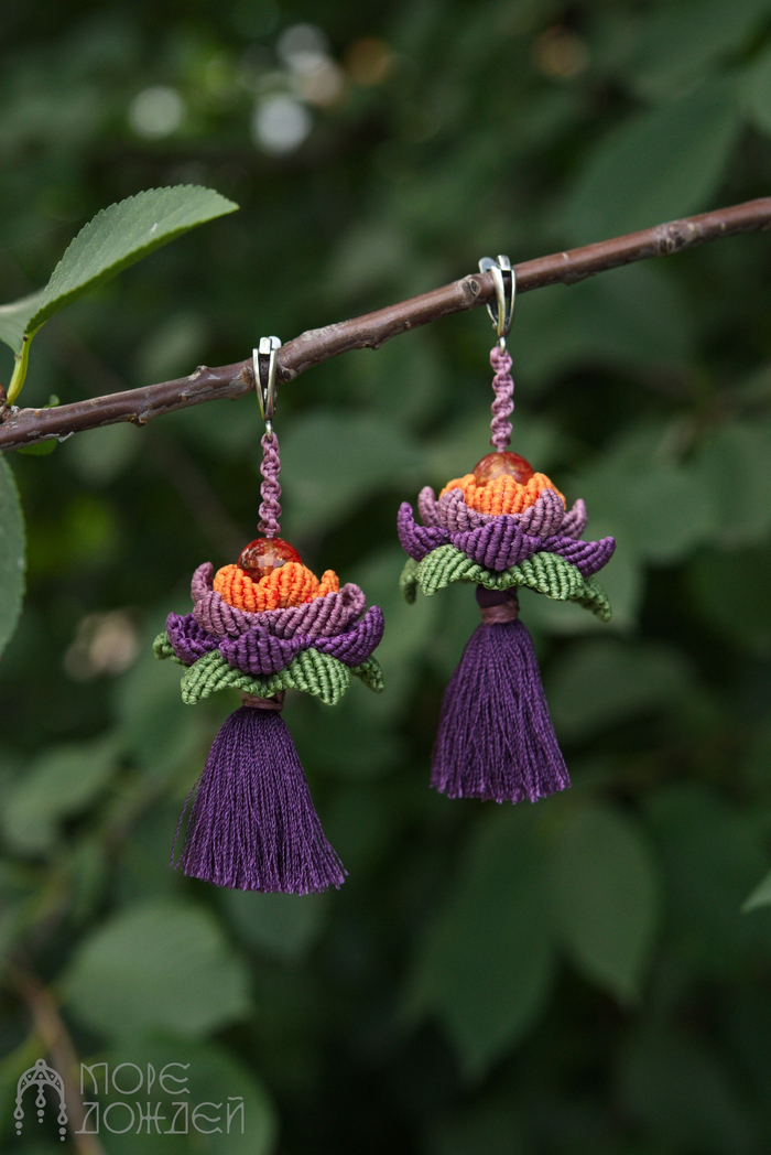 Микромакраме украшения хороши тем, что они лёгкие и большая часть их веса получается только за счёт вставок, бусин и фурнитуры. Получается, что можно плести довольно объёмные серьги и не нагружать уши.