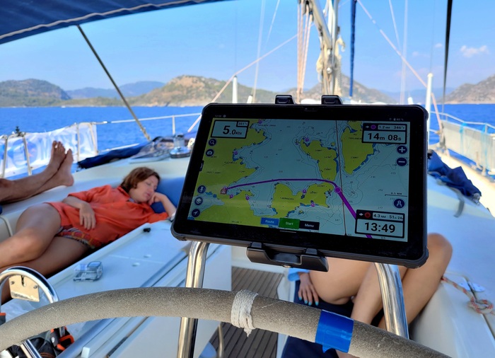 Завтрак, крепкий турецкий кофе (Mehmet Efendi - рекомендую) и - отдать швартовы. Пьер справляется с ними уже без тузика (динги, лодки, шлюпки), а вовсе даже вплавь. Отвязал от скалы, взял веревку в руки, мы его и вытащили. Вначале подветренный швартов, потом наветренный. Поднимаем якорь - и в путь.
