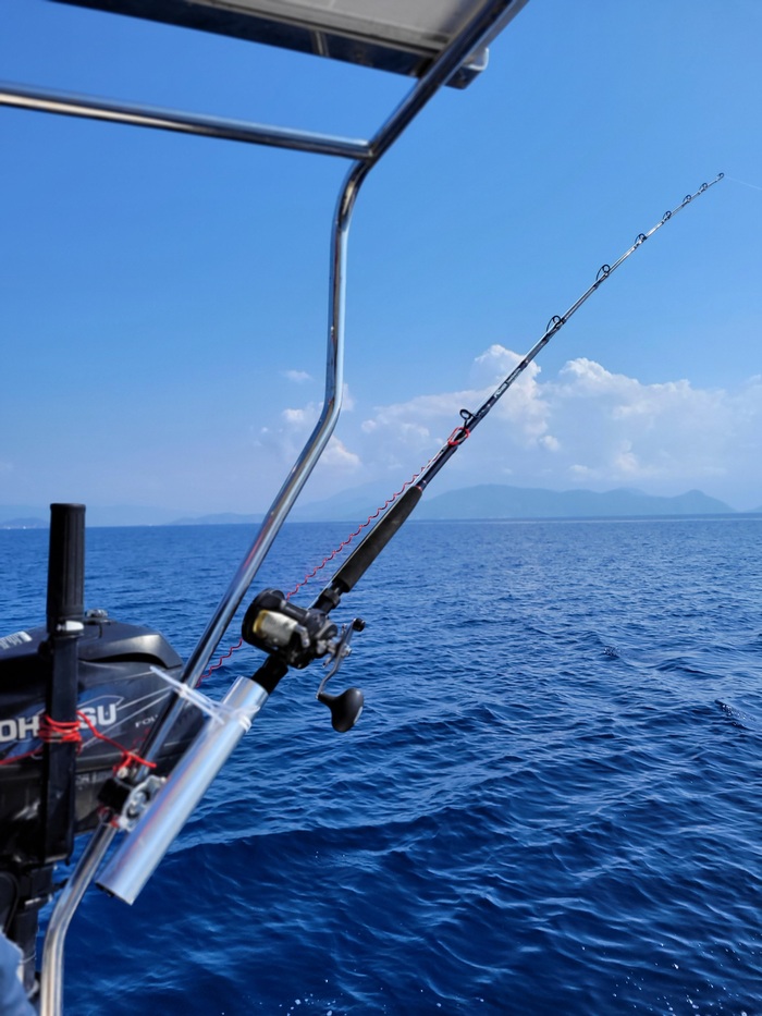 Ветер появился только в заливе Скопея, да неплохой. Минута - и идём под парусами, выключив мотор. Только журчание воды под форштевнем, да поскрипывания снастей. Хорошо!