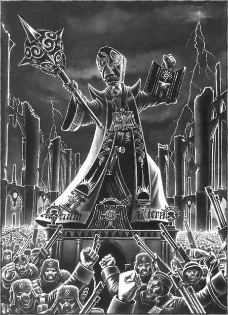 "Вы повинны во всепоглощающей ереси. Вы не только предали Императора и отвергли Его свет, вы опозорили Его имя и почти разрушили все, к чему Он стремился. Вы переврали и извратили тот путь, что Он избрал для человечества. И, как гласят ваши собственные декреты, за такое преступление не может быть пощады. К такому преступнику не может быть снисхождения. Я лишаю вас сана, ваш путь лежит во тьме и вам не может быть позволено жить дальше. Ваш приговор вынесен, и сейчас вы умрете".