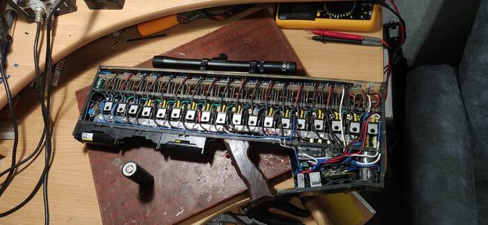 Гаусс Винтовка почти готова,осталось дождаться несколько деталей с Али экспресс, лазерный прицел и ключ зажигания)))общий вес вышел 2,5кг длинна 500мм ширина 30мм высота 200мм два режима 1 это скорость 103м/с и зарядка за 2сек и 2 это 160-168м/с за 5сек снаряды шары 4,5мм .