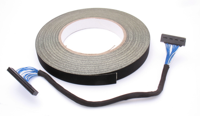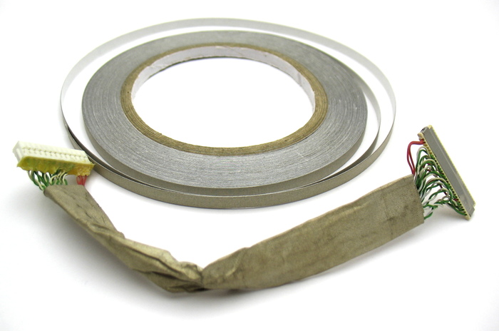Экранирующая лента. Это полимерная ткань, на которой гальванически выращен слой металла, она проводит ток и отлично гнется, что позволяет использовать ее для создания экранов у шлейфов.